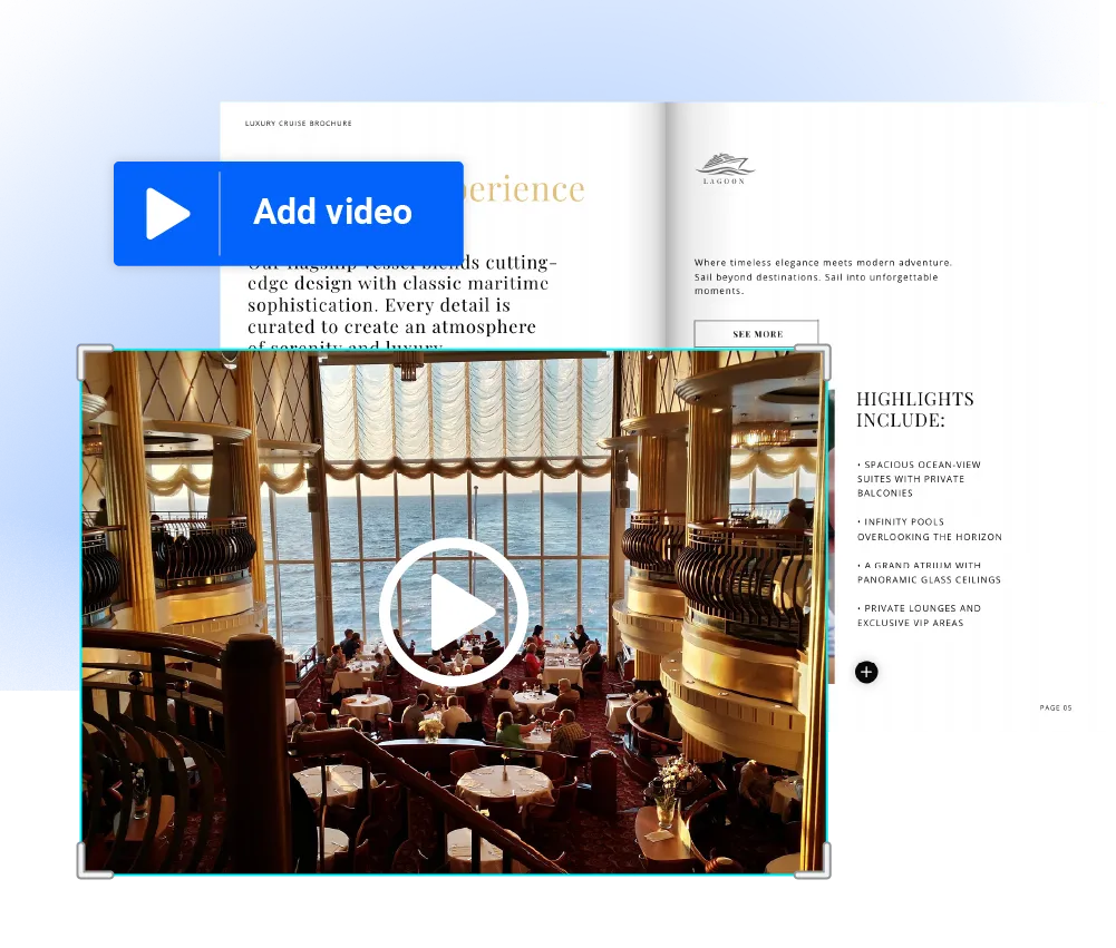 As companhias de cruzeiros produzem alguns dos catálogos de viagens com mais conteúdo. Com o Flipsnack, você pode publicar guias interativos de excursões terrestres, programas de atividades a bordo e folhetos de itinerário que envolvem os hóspedes antes e durante a viagem — e atualizá-los instantaneamente quando os detalhes mudarem.