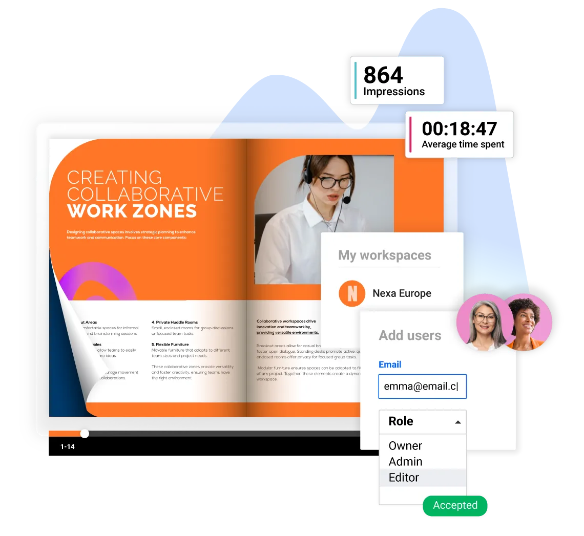 Ja. Teams können Rollen zuweisen, Berechtigungen festlegen, Kommentare hinzufügen und Bewertungsstatus wie „Prüfung ausstehend“ verwenden. Bei Flipsnack können nicht mehrere Personen dasselbe Dokument gleichzeitig bearbeiten, wodurch Probleme beim Überschreiben vermieden werden.