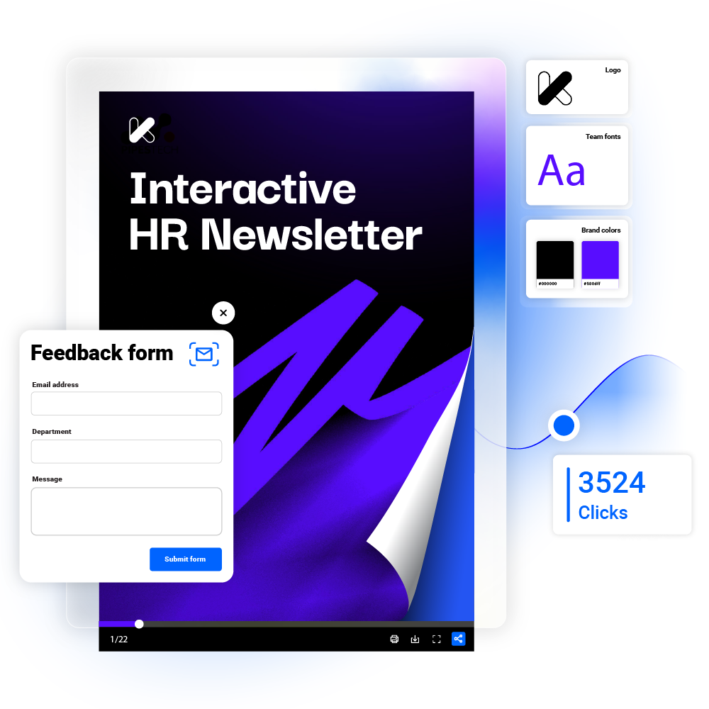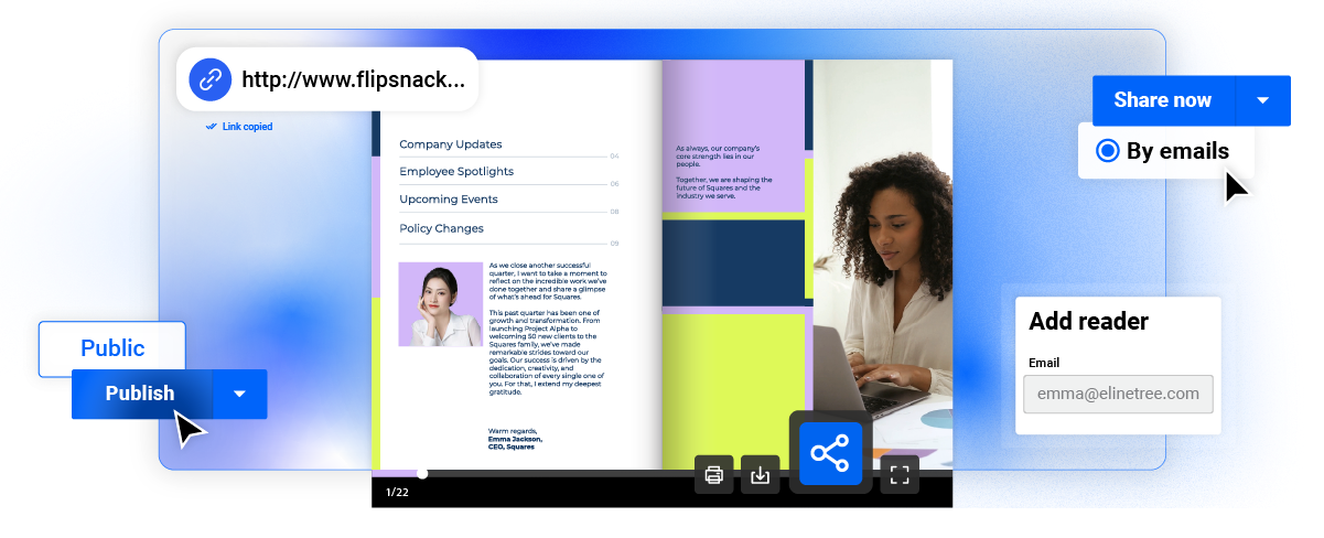 Communicate important company updates and product announcements effortlessly with Flipsnack’s newsletter generator. Keep employees and stakeholders engaged with interactive digital newsletters featuring videos, forms, wishlists, and other dynamic elements. Share your newsletter via email and ensure everyone stays informed with real-time updates.