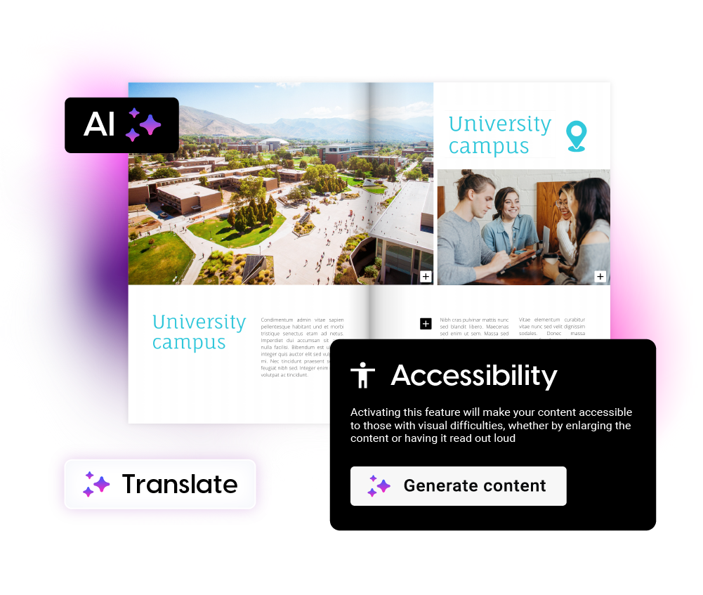 Rendi il tuo lavoro facile da leggere per tutti. Attiva lo strumento di accessibilità nel tuo flipbook HTML5 per mantenere queste funzionalità quando lo scarichi. Chi utilizza screen reader o una tastiera può leggere i tuoi contenuti con la stessa facilità di chiunque altro.