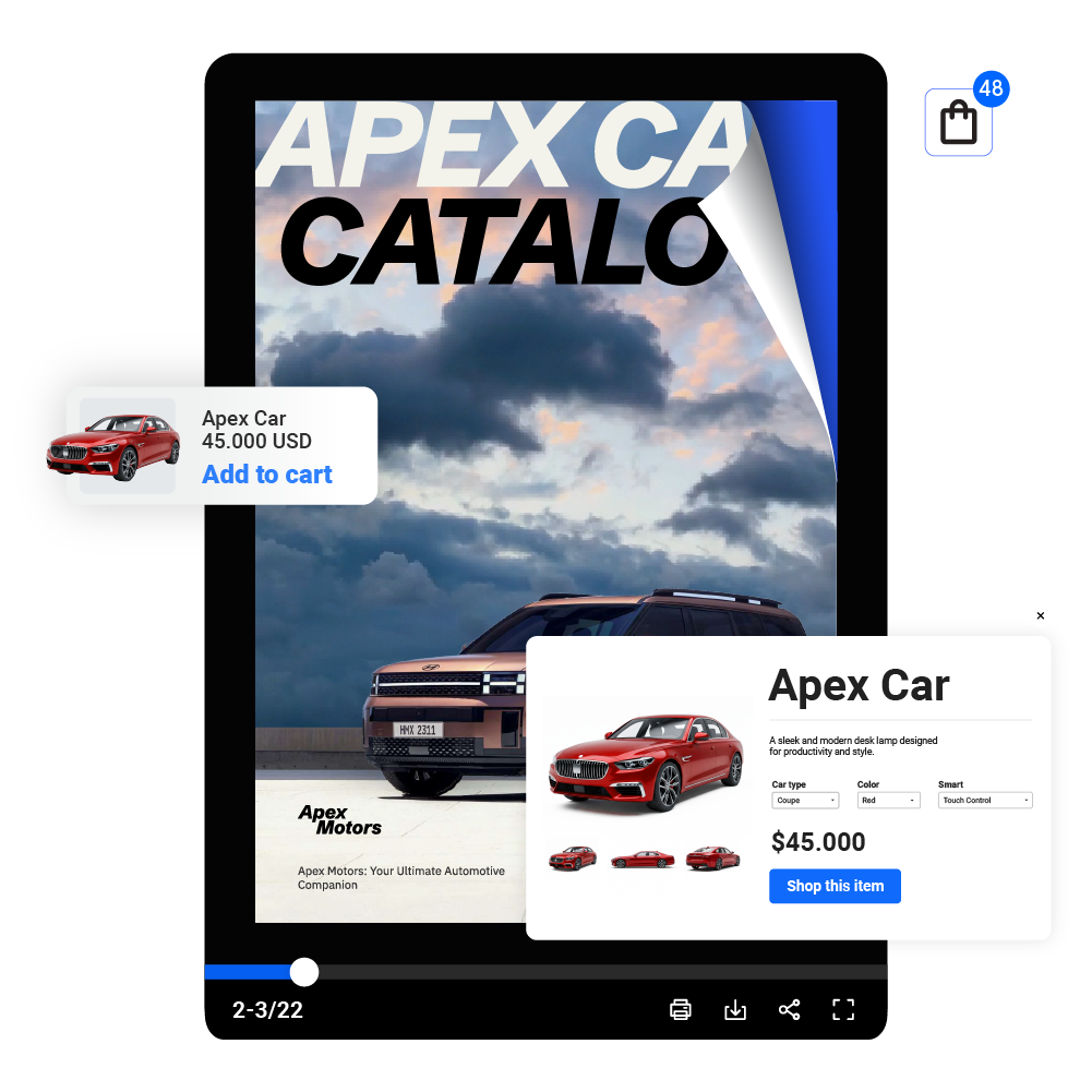 Attira i clienti grazie a un'esperienza di acquisto interattiva che include tag prodotto, pulsanti di acquisto, video di presentazione. E tutte coerenti con il marchio grazie a loghi, colori e stili tipografici. Consenti ai clienti di prendere decisioni informate grazie a un catalogo ordinato.
